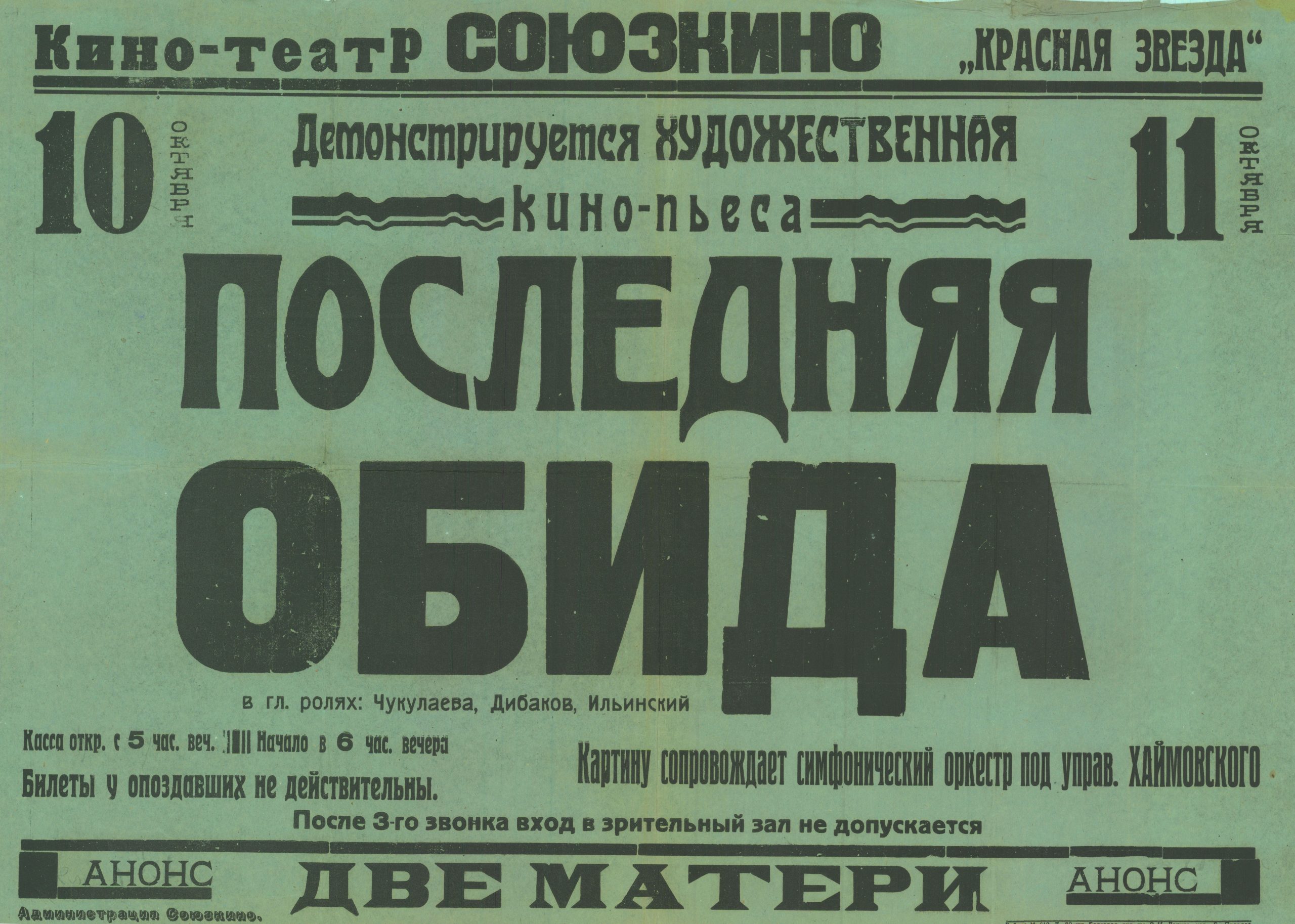 Actores: Piotr Masokha [Пётр Масоха] (Lopukhov, «el chico»), O. Krainskaya [О. Краинская] (Nina Kravchenko, su esposa), Mikhail Bolduman [Михаил Болдуман] (Zhuchenko, el maestro), M. Kundryutskiy [М. Кундрюцкий] (Fedia Panchuk), Vladimir Lisovskiy [Владимир Лисовский] (el nepman Shtokman, el saboteador)