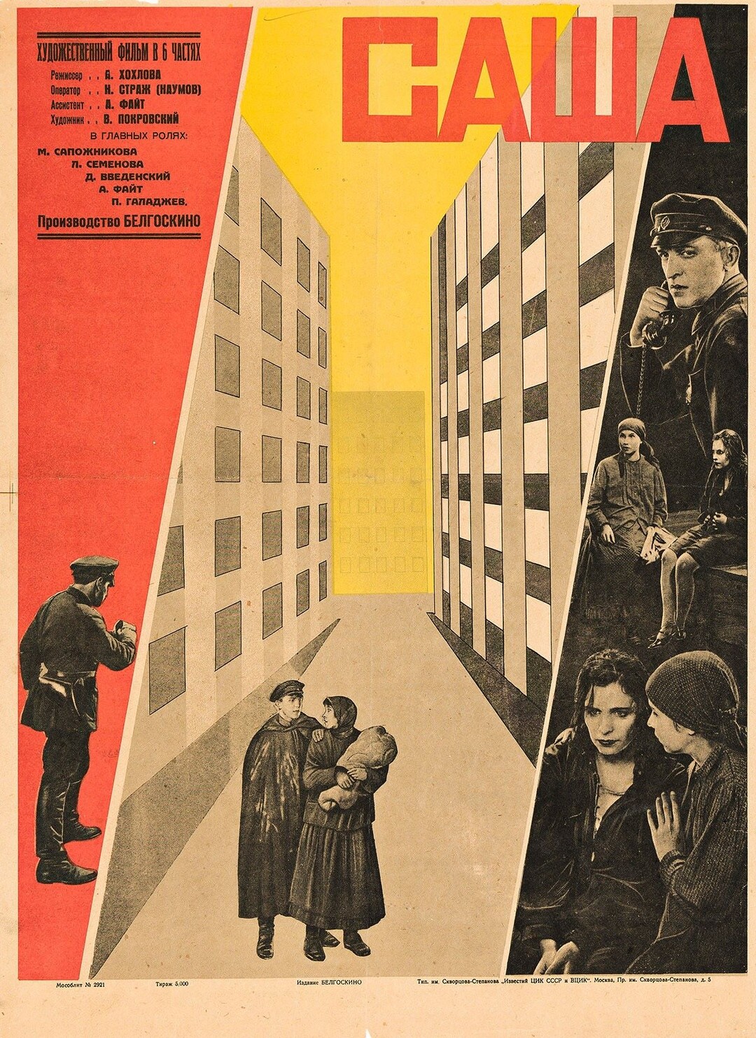 Actores: Mariya Sapozhnikova [Мария Сапожникова] (Sasha), Pavel Ilin [Павел Ильин] (Dmitri Kotov, su marido), Andrey Fayt [Андрей Файт] (Pepelnyak, policía), Piotr Galadzhev [Пётр Галаджев] (Iván Semenovich), Daniil Vvedenskiy [Даниил Введенский] (Smirenii, kulak), Lyudmila Semionova [Людмила Семёнова] (artista de un antro), Aleksandr Melnikov [Александр Мельников], Leonid Kmit [Леонид Кмит]