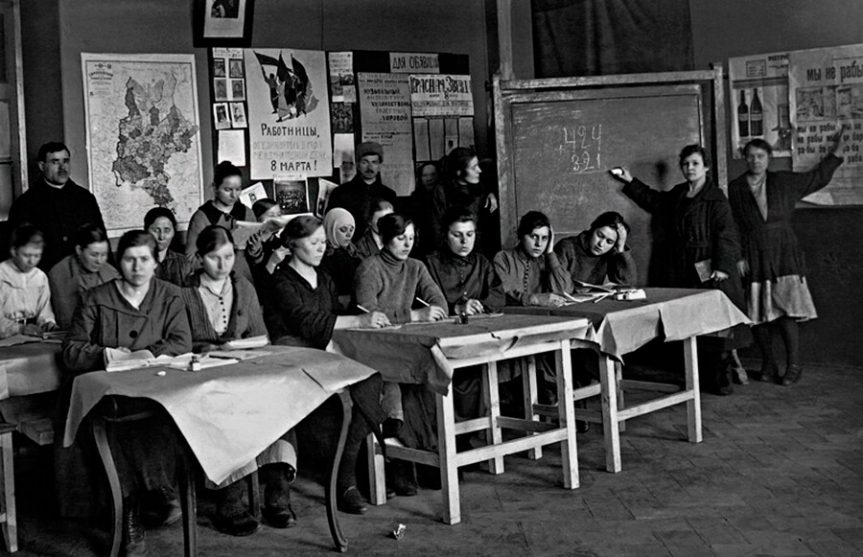 Imagen de portada: Lección en la escuela de alfabetización del club de trabajadores «Estrella Roja» (Fuente)