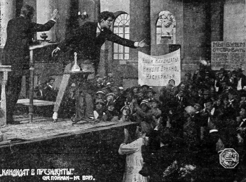 Título alternativo: El candidato a la presidencia Dirección: Piotr Chardynin [Петр Чардынин] Guion: Valentin Turkin [Валентин Туркин] Operador: Boris Zavelev [Борис Завелев] Director artístico: Vladimir Egorov [Владимир Егоров] Productora: VUFKU (Odessa) [ВУФКУ (Одесса)] Actores: Ivan Khudoleev [Иван Худолеев] (Nicolo Ornano, banquero), Zoya Baranchevich [Зоя Баранцевич] (Noris, su esposa), Oleg (Osip) Frelikh [ Олег (Осип) Фрелих] (Cascarilla, candidato a la presidencia), Boris Chuevsky [Борис Чуевский] (conde Guido), Nikolay Panov [Николай Панов] (Tapioca, ladrón), L. Negri [Л. Негри] (prefecto de policía), Karl Tomsky [Карл Томский] (oficial), Boris Shlikhting [ Борис Шлихтинг] (policía), Yavorsky [Яворский], Grigorov [Григоров], Rudakov [Рудаков] (periodistas).  Género: Adaptación cinematográfica Datos técnicos: 6 bobinas, 1615 m. Estreno: 1-1-1924 (Leningrado), 31-7-1924 (Moscú).
