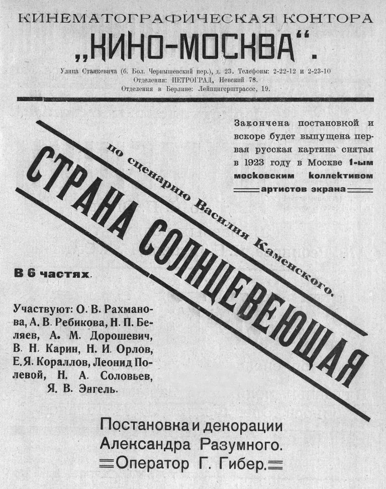 Título alternativo: La tierra del sol radiante [Страна солнцевеющая] Dirección: Aleksandr Razumnyy [Александр Разумный] Guion: Vasiliy Kamenskiy [Василий Каменский] Operador:  Grigoriy Giber [Григорий Гибер], Piotr Ermolov [Петр Ермолов] Director artístico: Aleksey Utkin [Алексей Уткин] Productora: Kino-Moskva [Кино-Москва] Actores: A. Doroshenko [Александр Дорошенко] (Gribushin, fabricante), O. Rakhmanova [Ольга Рахманова] (su esposa), Aleksandra Rebikova [Александра Ребикова] (Sonya, su hija), Georgiy. Engel [ Георгий Энгель] (Georges, su hijo), Nikolay Solovyov [Николай Соловьев] (Vladimir, el hijo mayor de los Gribushin), Nikolay Orlov [Николай Орлов] (Penkov, artista), Leonid Polevoy [Леонид Полевой] (Máximo, estudiante y tutor), E. Korallov [Е. Кораллов] (barón Krantz), Vladimir Karin [Владимир Карин] (Fedor, obrero), Olga Obolenskaya [Ольга Оболенская] (su esposa), Nikolay Belyaev [Николай Беляев] (Zmakov, profesor), Fedor Evdokimov [Федор Евдокимов] (chofer de los Gribushin), Olga Lenskaya [Ольга Ленская] (criada), Arseniy Bibikov [Арсений Бибиков] («personaje oscuro»).  Género: Drama Datos técnicos: 6 bobinas, 2100 m. Estreno: 6-4-1923. La película no se ha conservado.