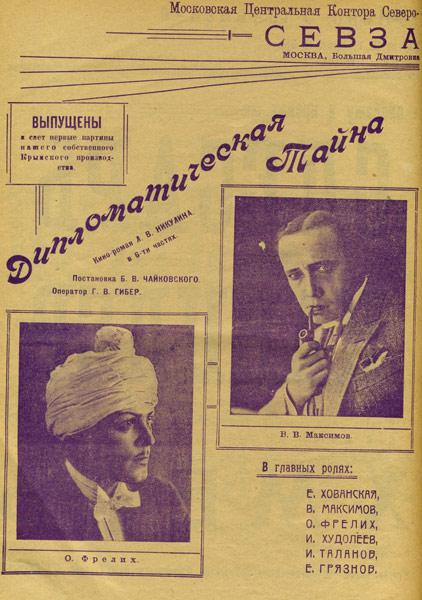 Dirección: Boris Chaykovskiy [Борис Чайковский] Guion: Lev Nikulin [Лев Никулин] Operador:  Grigoriy Giber [Григорий Гибер] Productora: Sevzapkino (M.) [Севзапкино] Actores:  Evgeniya Khovanskaya [Евгения Хованская] (Lucy Eno), Vladimir Maksimov [Владимир Максимов] (Gerd, secretario de la embajada), Oleg (Osip) Frelikh [Олег (Осип) Фрелих] (Ali-khan, secretario del consejo de ministros), Iona Talanov [Иона Таланов] (Mirza Ahmed-khan), I. Khudoleev [Иван Худолеев] (Osman, líder de la oposición), Evgeniy Gryaznov [Евгений Грязнов] (Zhukov), Nina Savskaya [Нина Савская] (Natasha, prometida de Zhukov), Vasiliy Kozhura [Василий Кожура] (Savitsky, ex capitán de Estado Mayor). Género: Adaptación cinematográfica Datos técnicos: 6 bobinas,  1800 m. Estreno: 14-12-1923. La película no se ha conservado.